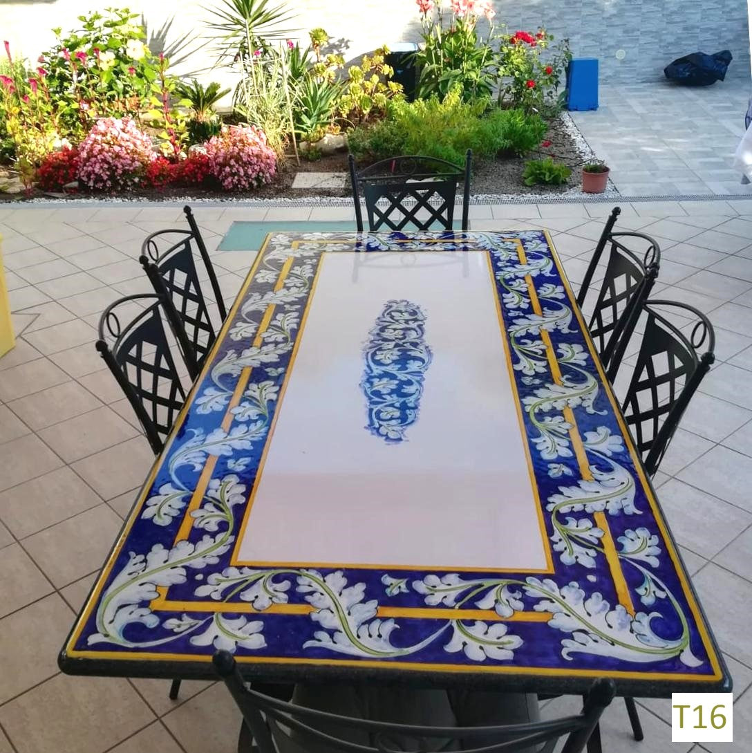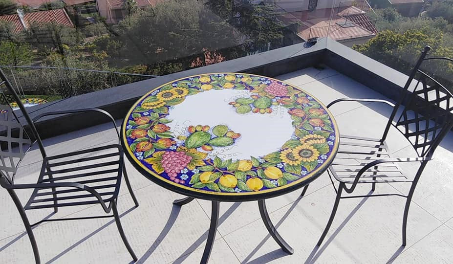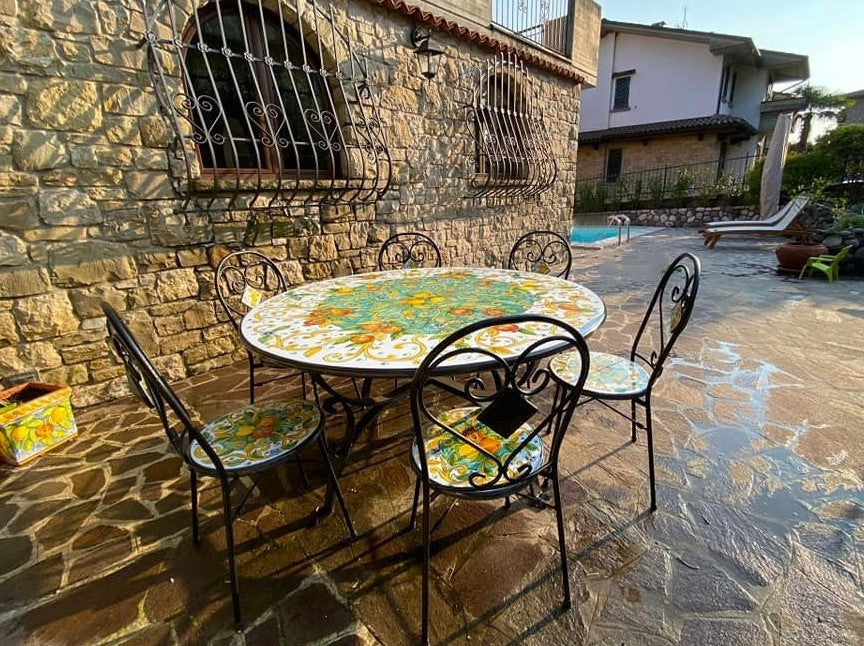 Tavolo rotondo in pietra lavica dipinta a mano, con base in ferro battuto pieno lavorato a mano, robusto e la base è solida e smontabile, e piano con ornamenti tipici della tradizione mediterranea.
