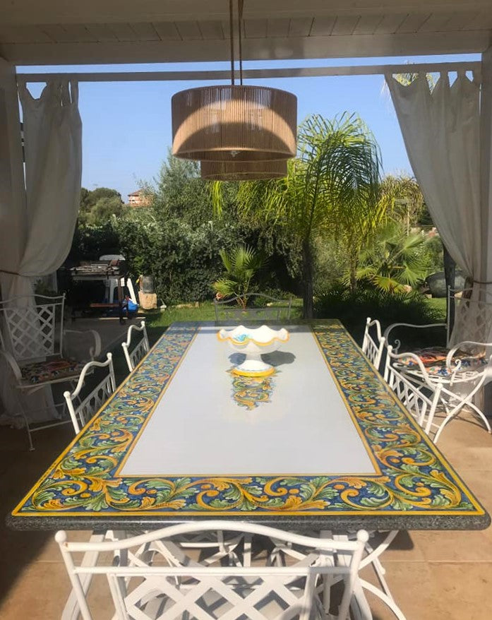 Il piano in pietra lavica è lavorato e dipinto a mano da artisti siciliani secondo metodi tradizionali locali.